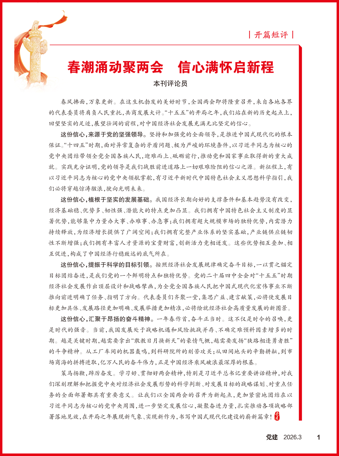 《党建》评论员丨春潮涌动聚两会 信心满怀启新程