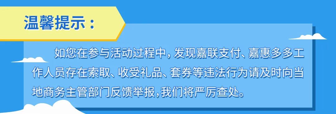 新入网的商户在报名成功后,需配合向嘉联支付工作人员提供入网材料(如:法人身份证正反面照片、收款银行账户照片、门头照、场所照、收银台照片等),入网成功、购买指定核销机设备并完成配置后方可参加活动。