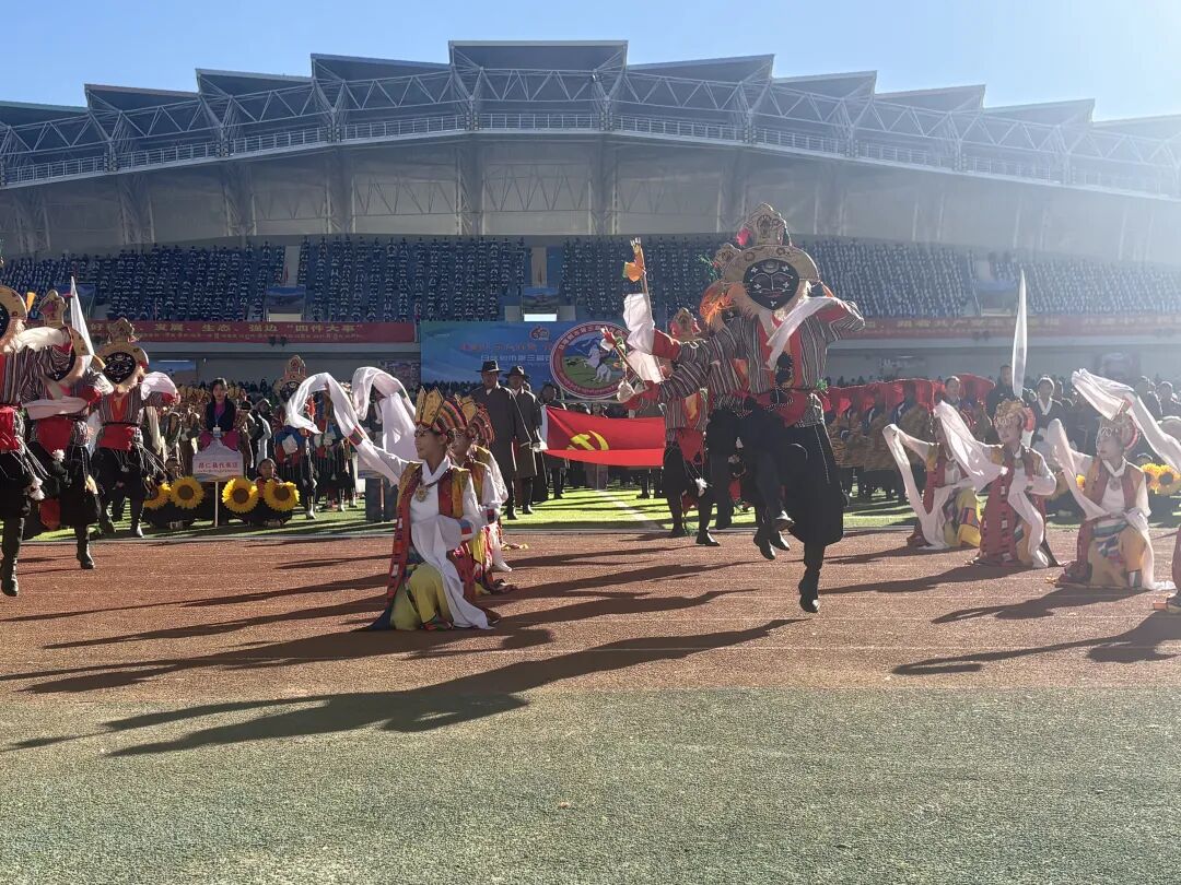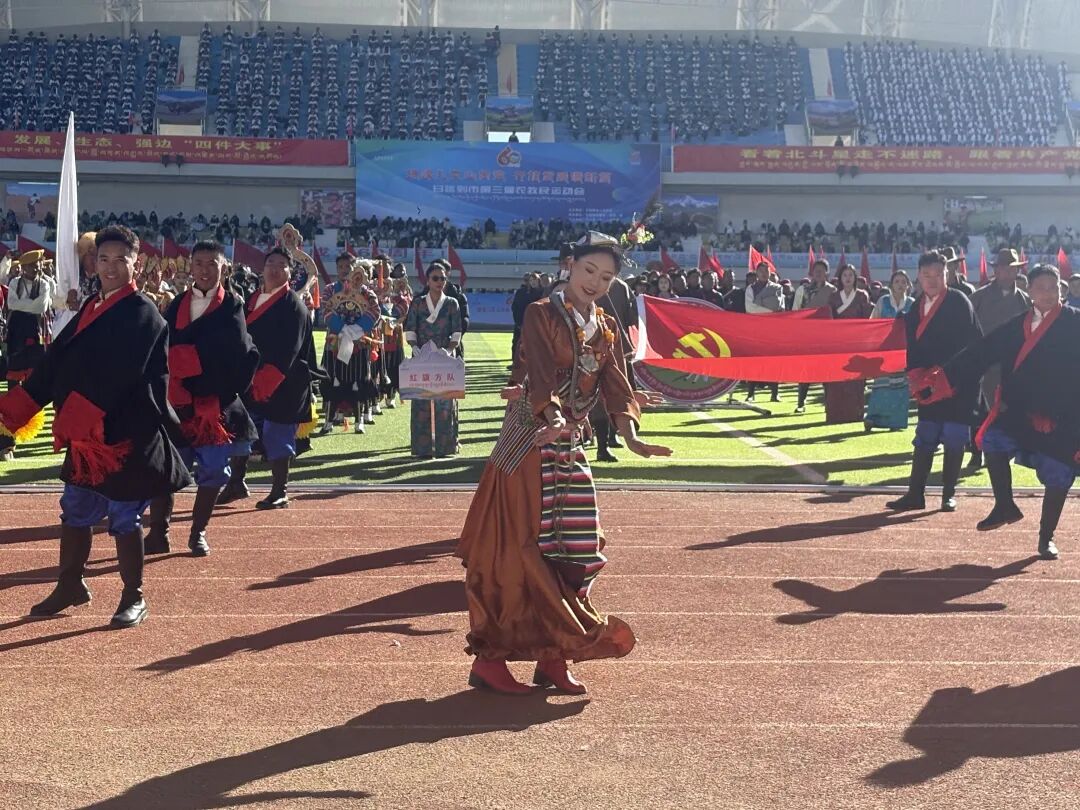 方阵就位,全场肃立。五星红旗在高原蓝天下冉冉升起,国歌声回荡耳畔。随后,开幕式演出以“高原儿女的幸福生活与精神传承”为主线,分《人杰地灵》《富强康乐》《浩气长存》三大篇章,近十个节目轮番登场:群舞《格桑啦》铺开五彩花海,歌曲《hello日喀则》以流行节拍彰显开放姿态,民歌《呀啦嗦》高亢入云,大合唱《永远跟党走》汇成澎湃声浪、凝聚温暖力量。