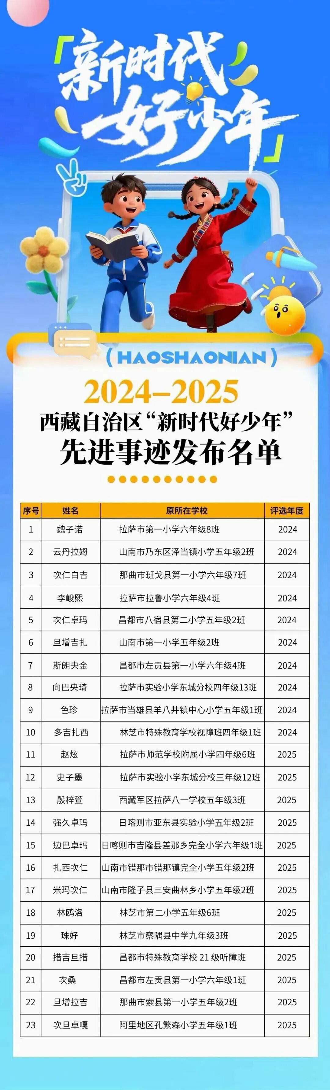 2024—2025年西藏自治区“新时代好少年”先进事迹发布仪式11月5日在日喀则市举办。经各地市推荐和专家评审等环节,共有23名品学兼优、朝气蓬勃,在传承红色基因、加强民族团结、弘扬爱国守边精神、勤奋好学、全面发展、乐于助人、自强不息的“新时代好少年”光荣上榜。