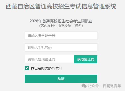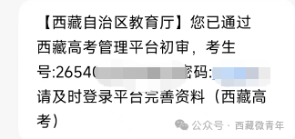 考生预报名信息提交后,请耐心等待地(市)教育招生考试机构审核,若审核未通过,系统将向注册手机发送审核不通过原因,请考生及时登录系统修改填报信息或替换相关材料,并重新提交审核。若审核通过,系统则向注册手机发送考生号和密码,该考生号和密码用于登录报名系统。注册手机请勿拦截以106开头、签名为【西藏自治区教育厅】的西藏教育考试招生短信,并及时关注和妥善保管报名系统发送的相关短信。