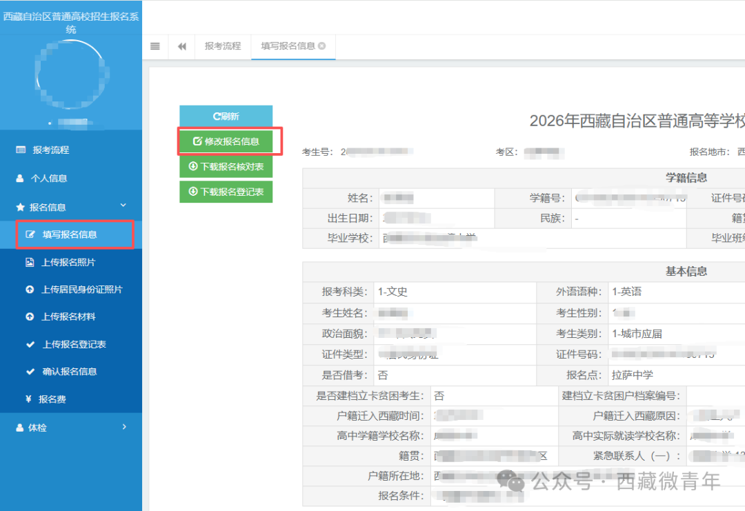 考生报名信息审核通过后,将进行信息确认。考生须下载打印《2026年西藏自治区普通高等学校招生报名登记表》,并逐项认真核对《报名登记表》上的基本信息、简历信息、户籍及监护人信息、照顾政策、加试申请、面试申请等各项报名信息,申请中勾选内容将是后续参加各类加试、面试的前提,请考生结合实际仔细勾选,若因自身原因忘记勾选,后果由考生本人自负。各项信息核对无误后,考生和家长须在《报名登记表》上共同签字并扫描上传,已签字的报名登记表上传后,方可进行确认报名信息,报名信息一经确认将不可更改。如考生进行了网上信息填报而没有上传签字后的《报名登记表》则报名无效。