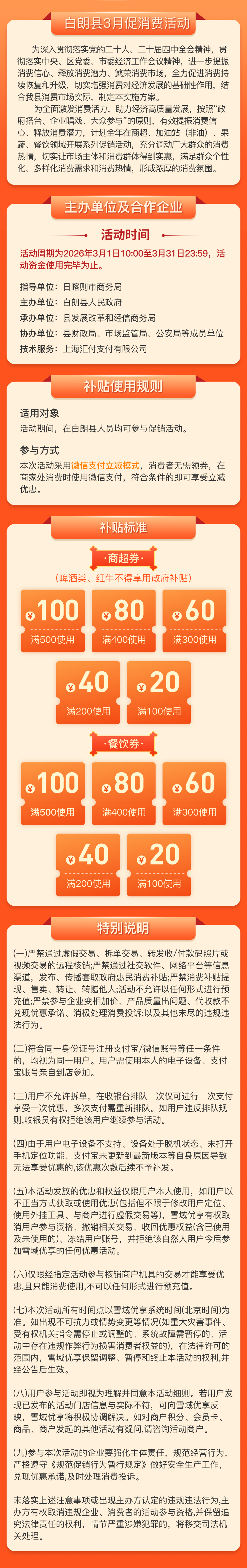 补贴类型及标准:商超、餐饮,满500元减100元、满400元减80元、满300元减60元、满200元减40元、满100元减20元