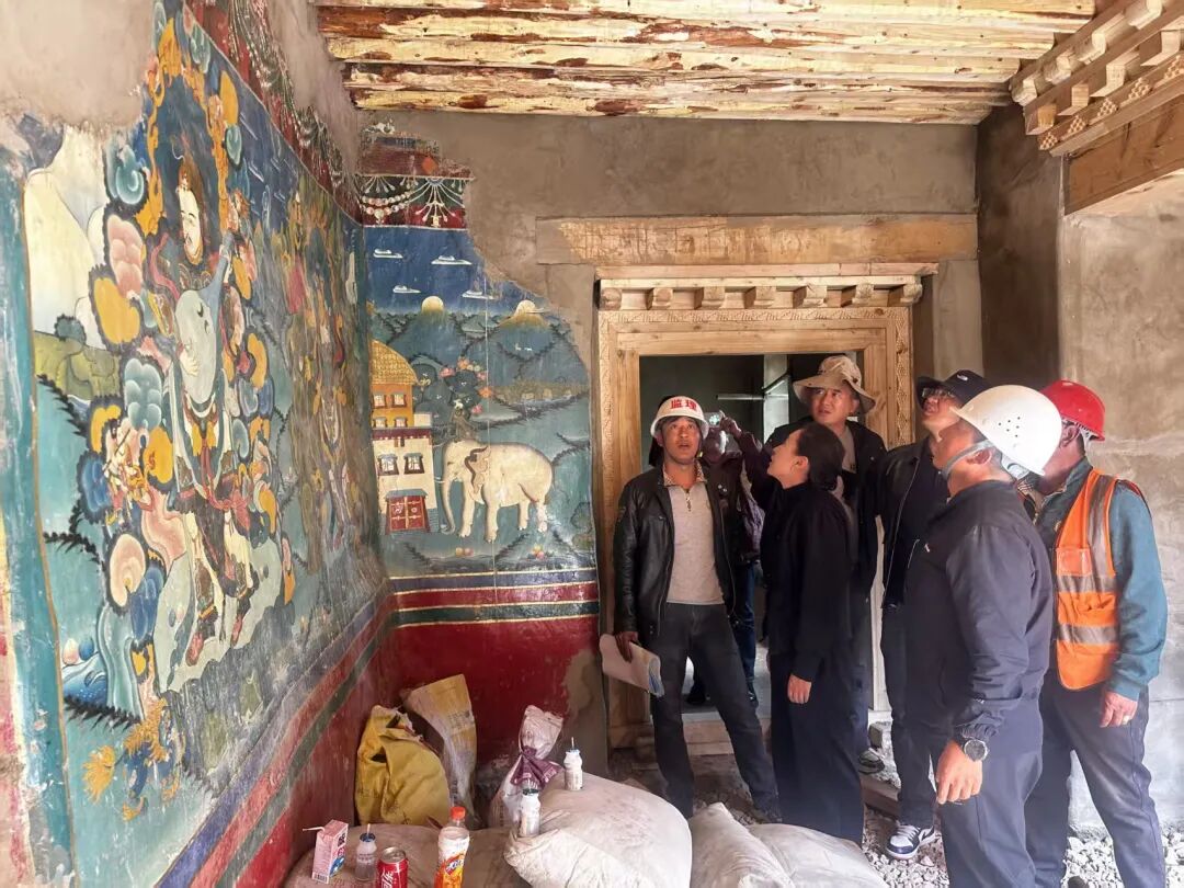 检查组一行深入文物保护单位林嘎寺、达那土旦寺、文工鼎、色多坚寺修缮工地及文物本体区域,重点对施工现场的脚手架搭建、施工用电、消防设施配备,以及文物建筑本体的结构安全、壁画保护等方面进行了全面细致的检查。