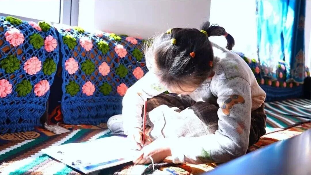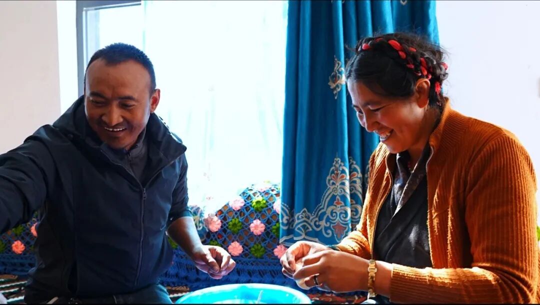正逢孩子们周末放假回家,夫妻二人便忙碌地张罗着晚餐。灶上的水咕嘟作响,普布扎西细心挑选熬汤的骨头,央金熟练地准备着馅料,夫妻俩并肩而坐,一边包着包子,一边轻声交谈。央金不时指点着丈夫手上的动作,传授包包子的诀窍。儿子和女儿沐浴在夕阳的余晖中,安静而专注地写着作业。