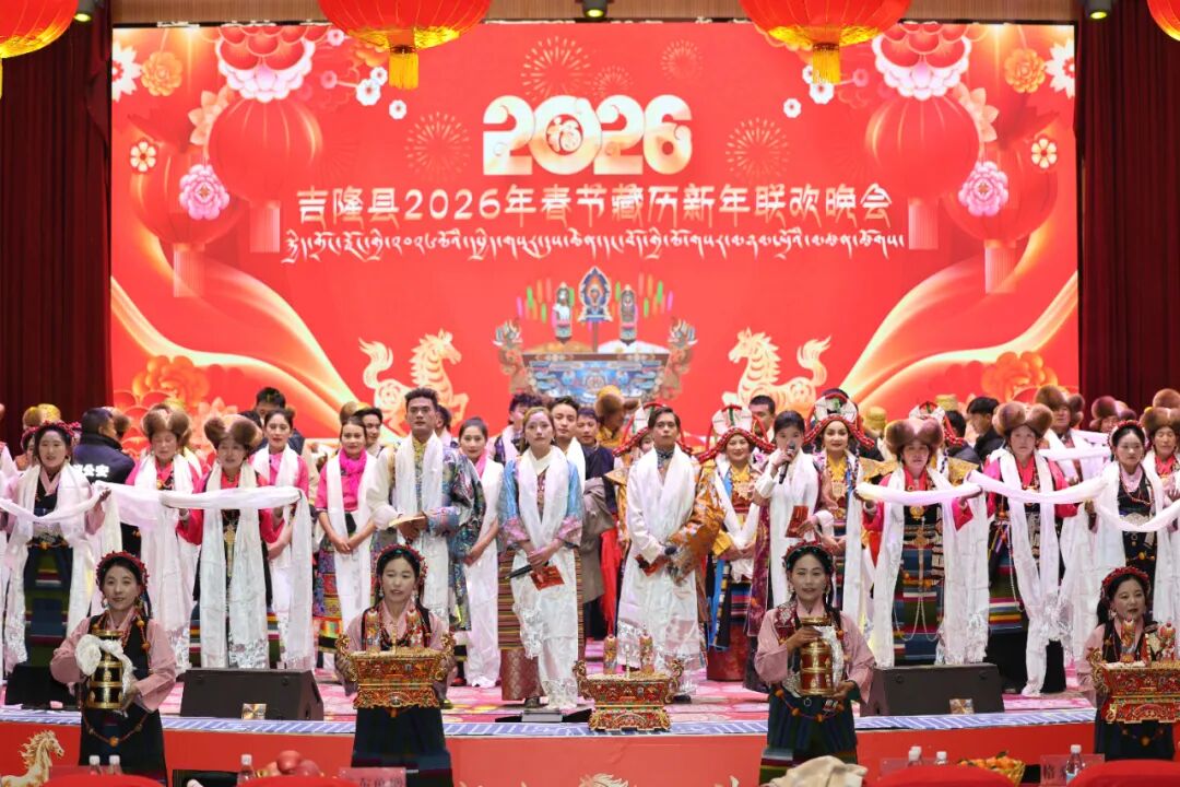 2月13日晚,吉隆县2026年春节、藏历火马新年晚会在县大礼堂圆满落幕。县领导与全县各族干部群众代表、线上直播观众欢聚一堂,共庆双节、共话发展、共绘蓝图。