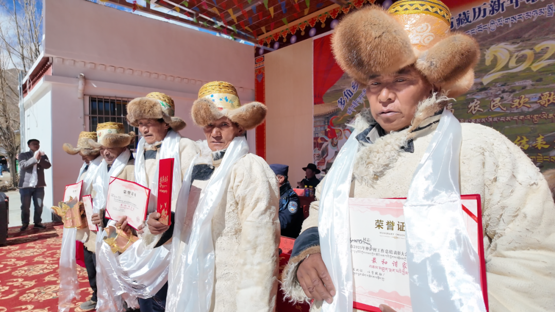 活动现场表彰最美婆婆、最美媳妇、最具孝心家庭、土豆经纪人等先进个人及家庭共 35 名,为获奖者发放藏式铜制青稞杯等物资及奖金,累计发放奖金 10500 元。日喀则市文化和旅游局驻村工作队、村致富带头人同步慰问全村107户,发放大米、面粉、青稞杯等物资,慰问资金合计5.5万元。