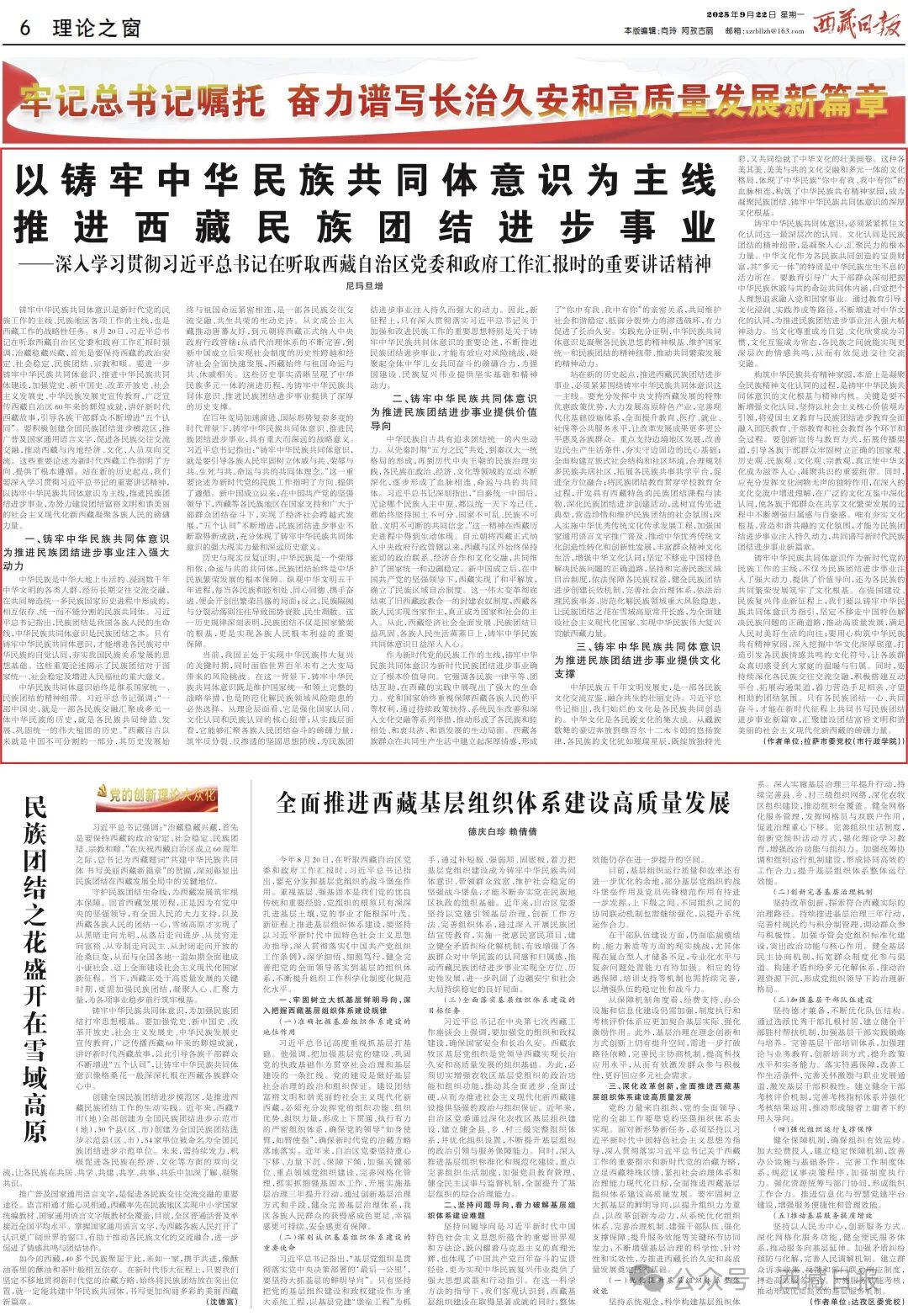 铸牢中华民族共同体意识是新时代党的民族工作的主线、民族地区各项工作的主线,也是西藏工作的战略性任务。8月20日,习近平总书记在听取西藏自治区党委和政府工作汇报时强调,治藏稳藏兴藏,首先是要保持西藏的政治安定、社会稳定、民族团结、宗教和顺。要进一步铸牢中华民族共同体意识、推进中华民族共同体建设,加强党史、新中国史、改革开放史、社会主义发展史、中华民族发展史宣传教育,广泛宣传西藏自治区60年来的辉煌成就,讲好新时代西藏故事,引导各族干部群众不断增进“五个认同”。要积极创建全国民族团结进步模范区,推广普及国家通用语言文字,促进各民族交往交流交融,推动西藏与内地经济、文化、人员双向交流。这些重要论述为新时代西藏工作指明了方向、提供了根本遵循。站在新的历史起点,我们要深入学习贯彻习近平总书记的重要讲话精神,以铸牢中华民族共同体意识为主线,推进民族团结进步事业,为努力建设团结富裕文明和谐美丽的社会主义现代化新西藏凝聚各族人民的磅礴力量。
