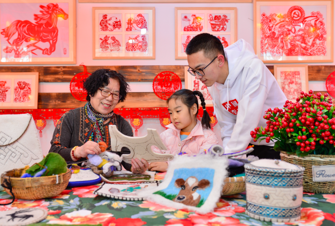 ▲在内蒙古呼和浩特市回民区莫尼山非遗小镇,游客体验蒙古族毡绣技艺。王正摄