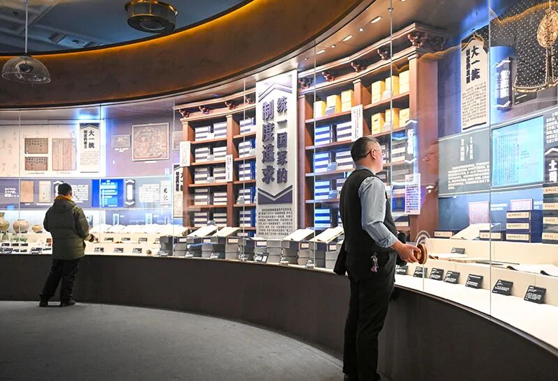 ▲参观者在北京民族文化宫“铸牢中华民族共同体意识文物古籍展”展厅。新华社记者 陈晔华 摄