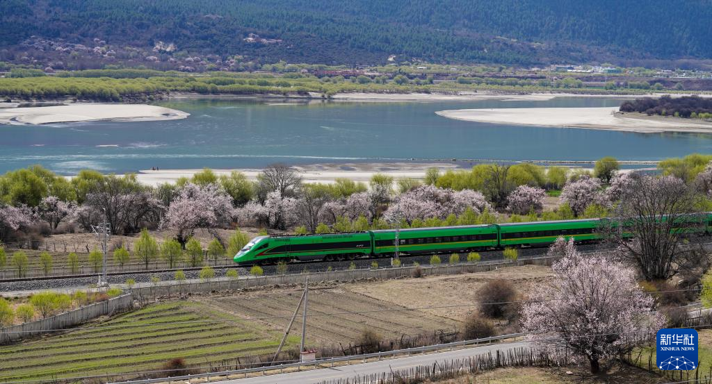 ▲复兴号列车穿行在拉林铁路林芝段(4月2日摄)。据悉,拉林铁路开通至2025年2月,已安全运送旅客369.22万人次、货物113.78万吨。作为西藏首条高原电气化铁路,拉林铁路的客运量和货运量正在持续增长。新华社记者 晋美多吉 摄