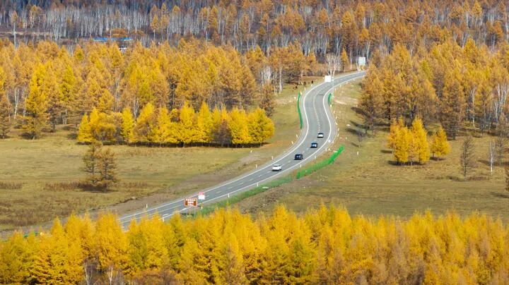 ▲2025年9月29日,游客在内蒙古阿尔山国家森林公园驾车游玩(无人机照片)。新华社记者 贝赫 摄