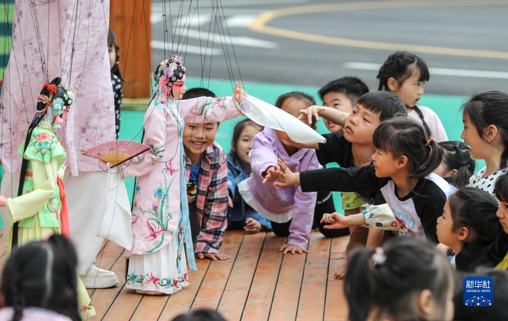 ▲江苏省苏州市吴江区积极推进非遗进校园活动。图为小朋友们近距离欣赏提线木偶。 新华社发