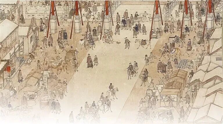 ▲“史叙共同体——北京建都史中的各民族交往交流交融”专题展览展出的清代《京师生春诗意图》局部。 吴艳 摄