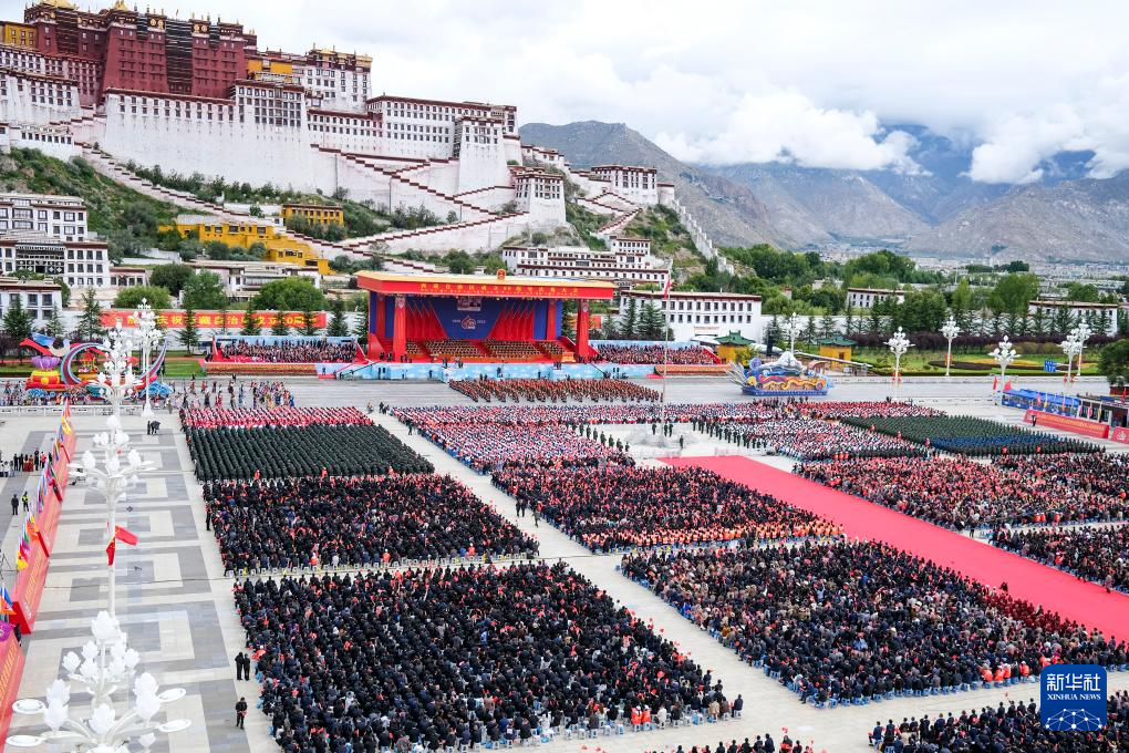 ▲2025年8月21日上午,西藏各族各界干部群众约2万人欢聚拉萨市布达拉宫广场,热烈庆祝西藏自治区成立60周年。这是庆祝大会现场。 新华社发(索朗旺久摄)