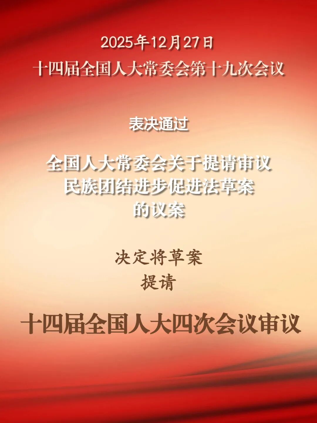 2025年8月29日,中共中央政治局召开会议,研究《中华人民共和国民族团结进步促进法(草案)》。会议指出,制定此法,目的是通过国家立法的方式把党在民族工作中取得的重大理论和实践成果转化为国家意志,健全“铸牢”制度机制,进一步增强中华民族凝聚力向心力。