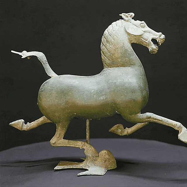 自古以来,西域盛产名马,尤以大宛马和乌孙马闻名。汉武帝时期,为求良马对抗匈奴骑兵,派遣张骞出使西域,由此开辟了连通东西的丝绸之路。《史记·大宛列传》载:“(汉武帝)得乌孙马好,名曰‘天马’。及得大宛汗血马,益壮,更名乌孙马曰‘西极’,名大宛马曰‘天马’云。”汉武帝还作有《西极天马歌》“天马徕兮从西极,经万里兮归有德。承灵威兮降外国,涉流沙兮四夷服”,称赞汗血马的神勇与赫赫战功。