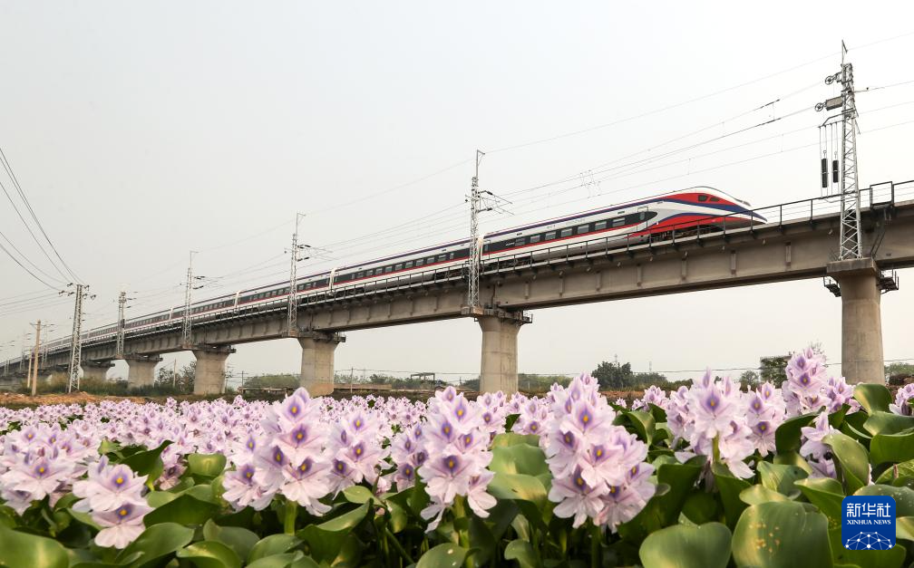▲从老挝万象站驶出的D888次“澜沧号”列车行驶在云南省西双版纳州境内的中老铁路橄榄坝特大桥上(2023年4月13日摄)。新华社记者 单宇琦 摄