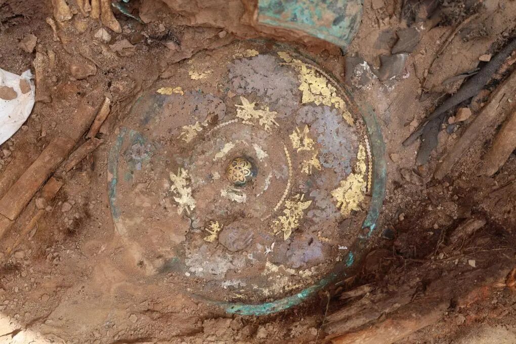 这是吐鲁番市巴达木东晋唐时期墓群出土的金银平脱花鸟纹铜镜(资料照片)。新华社 发