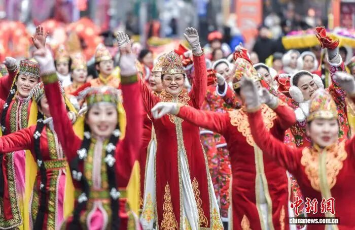 2月5日,新疆乌鲁木齐市闹市区西门老街锣鼓喧天,一场社火展演游街活动在此举行,吸引众多过往市民驻足观看。刘新 摄