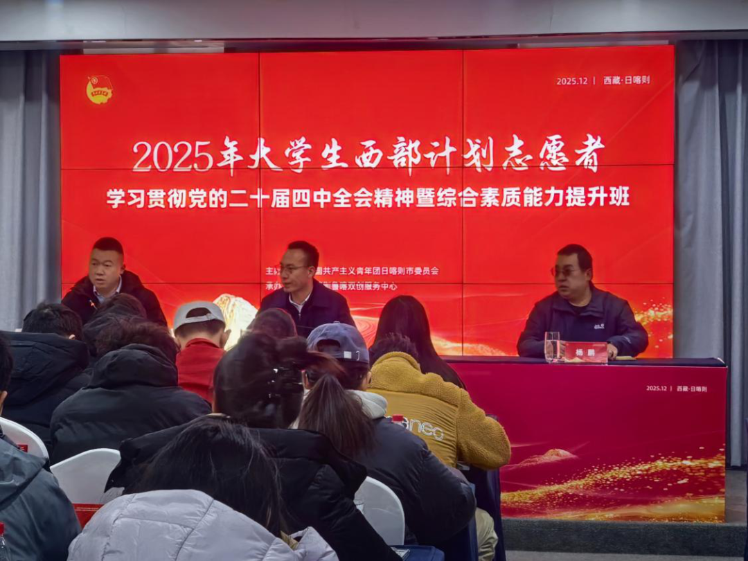 12月12日上午,由共青团日喀则市委员会主办的2025年大学生西部计划志愿者学习贯彻党的二十届四中全会精神暨综合素质能力提升培训班,在日喀则市舍里别院酒店隆重开班。团市委书记马德彪、办公室主任杨鹏出席开班仪式,120名新入职西部计划西藏专项志愿者齐聚雪域高原,以“理论+实践”的学习模式开启为期7天的赋能成长之旅。开班仪式由团市委青年发展和统战部部长邓家强主持。