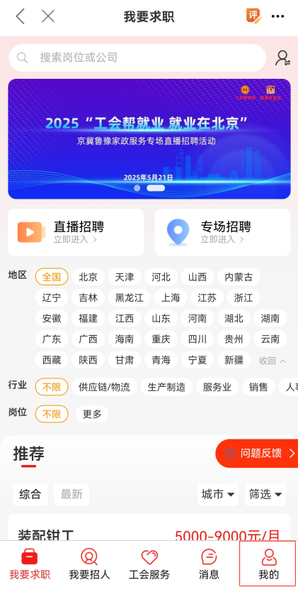 1.进入“职工之家”APP后,在下方【首页】页面中上滑,选择【就业帮扶】。