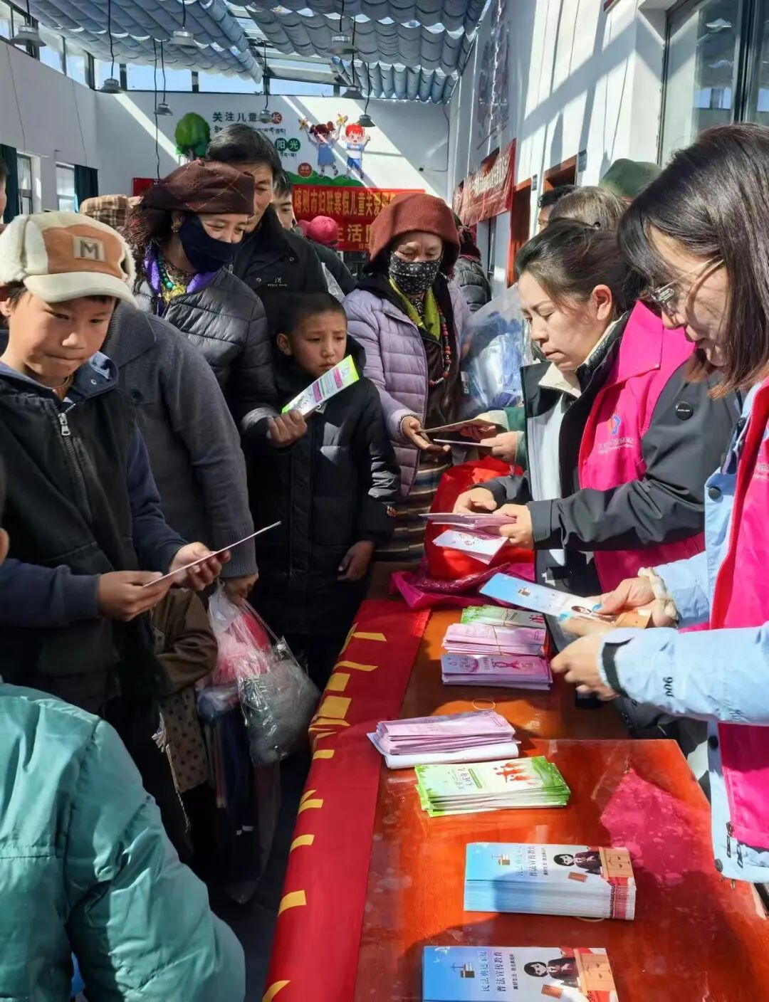 在萨迦县吉定镇德吉林村,派出所民警围绕居家安全、出行安全、防拐骗等方面安全知识宣讲,提升孩子们的自我保护意识。活动现场为113名困境儿童发放书包、爱心毛衣、笔袋、彩笔等学习用品及乒乓球拍、跳绳等文体物资,并组织投篮、百米赛跑、随机舞蹈等趣味互动,让孩子们在欢乐中增进友谊、收获成长。巾帼志愿者同步向家长发放《中华人民共和国未成年人保护法》《家庭教育促进法》等法治宣传手册,强化家长监护责任与家庭教育意识,共同织密儿童安全防护网。