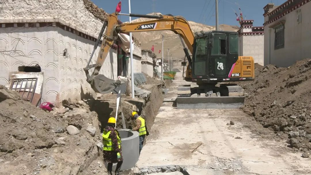 在吉隆县宗嘎镇加木村,人居环境整治施工现场,施工人员正忙碌进行污水管道安装和雨水沟盖破除工作,一片热火朝天的繁忙景象。大家正抢抓施工黄金期,不断刷新施工“进度条”,确保项目建设稳步有序推进。