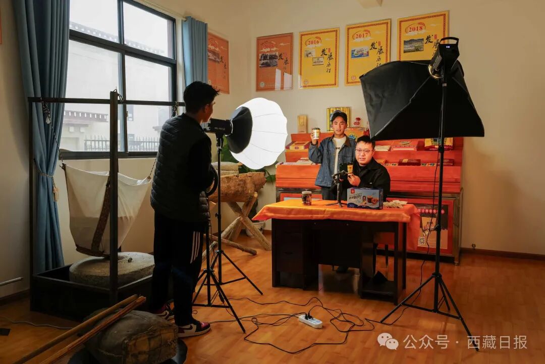 图为洛隆县洛宗特色产品开发公司的工作人员正在直播销售青稞挂面及青稞饼干。记者 丹增群培 摄