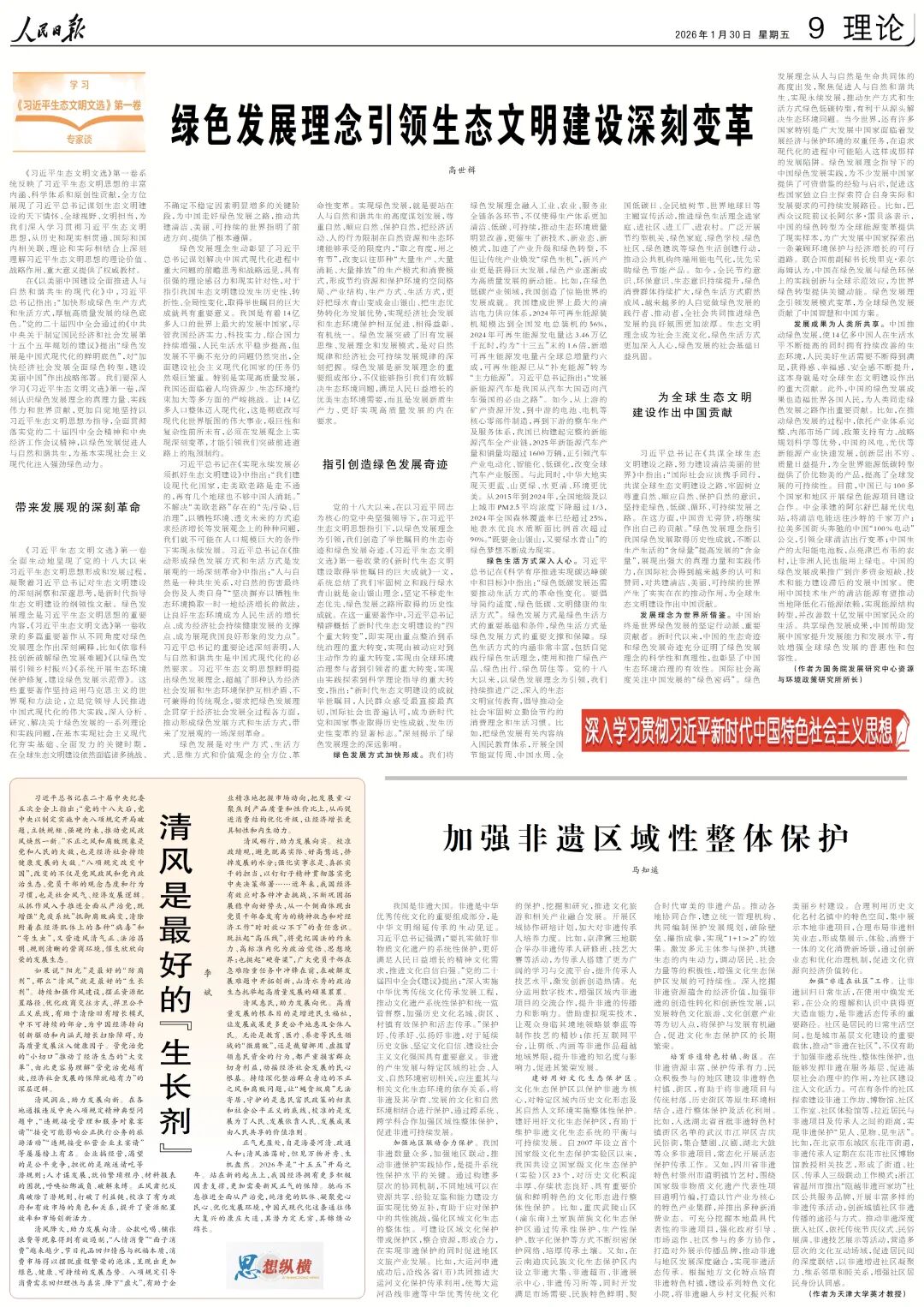 在《以美丽中国建设全面推进人与自然和谐共生的现代化》中,习近平总书记指出:“加快形成绿色生产方式和生活方式,厚植高质量发展的绿色底色。”党的二十届四中全会通过的《中共中央关于制定国民经济和社会发展第十五个五年规划的建议》提出“绿色发展是中国式现代化的鲜明底色”,对“加快经济社会发展全面绿色转型,建设美丽中国”作出战略部署。我们要深入学习《习近平生态文明文选》第一卷,深刻认识绿色发展理念的真理力量、实践伟力和世界贡献,更加自觉地坚持以习近平生态文明思想为指导,全面贯彻落实党的二十届四中全会精神和中央经济工作会议精神,以绿色发展促进人与自然和谐共生,为基本实现社会主义现代化注入强劲绿色动力。