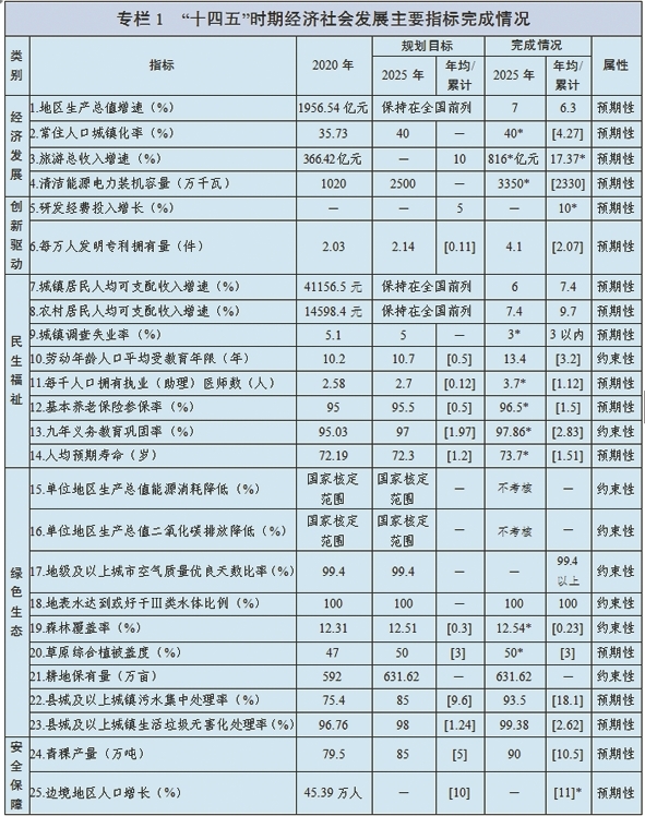 “十四五”时期西藏发展历程极不寻常、极不平凡。习近平总书记两次赴西藏视察,亲自为西藏工作领航掌舵,从党和国家事业全局出发系统谋划推进西藏长治久安和高质量发展,指引西藏步入发展最好、变化最大、各族群众得实惠最多的历史时期。五年来,在以习近平同志为核心的党中央坚强领导下,自治区党委、政府团结带领全区各族干部群众,坚持用习近平新时代中国特色社会主义思想统揽工作全局,深入贯彻习近平总书记关于西藏工作的重要指示和新时代党的治藏方略,锚定稳定、发展、生态、强边四件大事,着力创建全国民族团结进步模范区、高原经济高质量发展先行区、国家生态文明高地、国家固边兴边富民行动示范区,各项事业取得全方位进步、历史性成就,社会主义现代化新西藏建设迈出坚实步伐。一是社会大局和谐稳定。反分裂斗争深入开展,加大平安西藏建设力度,群众安全感满意度保持在99%以上,深入实施“四大工程”“六项行动”,创建全国民族团结进步模范区取得阶段成效,7个地(市)成功创建全国民族团结进步示范地(市),中华民族共同体意识不断铸牢,藏传佛教中国化积极推进,社会大局持续稳定向好。二是发展质效不断提升。高原经济高质量发展扎实推进,经济发展质量和效益持续提升,特色优势产业蓬勃发展,累计落实“十四五”规划投资6375亿元,地区生产总值2021年突破2000亿元大关、2025年突破3000亿元,“十四五”以来年均增长6.3%,增速保持全国前列。扎实推进城乡建设,常住人口城镇化率接近40%,建设高原和美乡村820个,牢牢守住粮食安全和不发生规模性返贫致贫底线。三是基础设施不断完善。川藏铁路建设加快推进,拉林铁路和拉那、拉日高速建成通车,拉萨贡嘎国际机场第二跑道、国际航站楼建成投运,具备条件的乡镇、行政村通畅率分别达100%、90%以上。雅下水电工程和藏粤直流输电工程开工建设。新增水利工程供水能力1.99亿立方米,新增和改善灌溉面积425.66万亩。开展5G、4G网络覆盖深耕行动,5G网络实现乡乡通。四是改革开放纵深推进。重点领域和关键环节改革持续推进,营商环境不断优化,行政审批事项减少近一半,政务服务事项网上可办率达到100%,国有企业改革、教育改革、零基预算改革及财政事权和支出责任划分改革等加快推进,林芝改革开放先行先试成效明显。稳妥有序扩大对外开放,日喀则国际陆地港加快建设。落实援藏资金217亿元,累计到位招商引资资金超过2700亿元。五是民生保障有力有效。积极实施就业优先战略,重点群体就业保持稳定,“十四五”以来城乡居民人均可支配收入年均分别增长7.4%、9.7%,城镇居民人均可支配收入超过全国平均水平。巩固15年公费教育政策全覆盖成果,西藏班招生规模突破1万人。统筹城乡的社会保障体系基本建成,率先在全国实现基本医疗保险省级统筹。积极推进健康西藏建设,全面落实“五个针对”要求,人民群众健康水平进一步提高。定日地震灾后恢复重建工作取得重大成效,3.32万户民房重建及维修加固完成并搬迁入住。六是生态底色越发厚实。国家生态文明高地创建取得明显成效,严格执行青藏高原生态保护法及自治区实施办法、自治区冰川保护条例,统筹山水林田湖草沙一体化保护和系统治理,推进大气、水、土壤环境综合治理,拉萨南北山绿化工程累计完成营造林100余万亩,7个地(市)和11个县(区)成功创建国家生态文明建设示范区。七是稳边固边能力有效提升。边境地区建设加快推进,米林等4个中心城镇加快建设,有序推进边境新村建设,巩固发展军政军民团结,边境地区生产生活条件大幅改善,固边兴边富民基础进一步夯实。