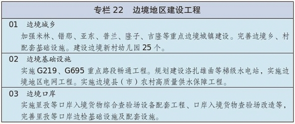 强化建管并重,提升边境薄弱地区基础设施覆盖面。推动沿边国道G219线和并行线G695线全面畅通,建设一批并行线、联络线,实现沿边公路与边境城镇有效衔接。因地制宜开发边境地区水能资源,提高边境地区电网覆盖能力,落实“安居特惠”用电政策,支持建设边境高寒地区供暖工程。推进“宽带边疆”建设,强化北斗卫星导航定位基准站网布局,提升边境偏远地区通信网络覆盖广度。加强边境地区防洪、灌溉、水源保障和供水、水土保持和水生态修复等水利工程建设,建立边境地区气象综合保障体系。加快建设边境地区国防动员体系、战略物资仓储物流体系,布局建设优抚医院、军供站点。