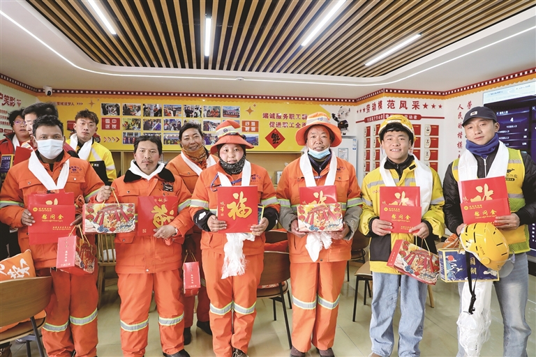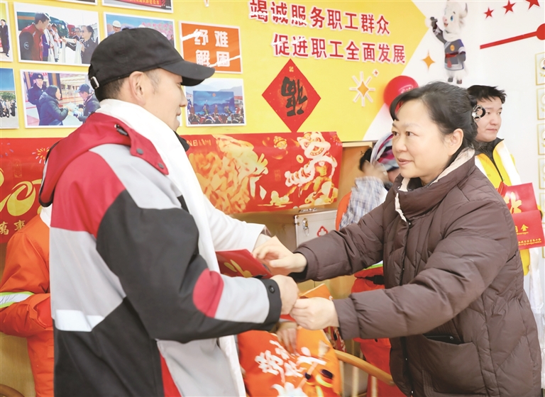 一句句关切的叮嘱,一声声温暖的祝福,让现场每一位劳动者都倍感亲切与动容。“天气冷,大家在外奔波一定要注意保暖,劳逸结合,安全第一。”唐明英语气朴实而真挚,每一句话都饱含着对新业态劳动者工作与生活的深切关怀。随后,她为每位新业态劳动者代表献上洁白的哈达,亲手发放节日慰问金和慰问品,让这份冬日里的坚守,多了一份坚实而温暖的力量。