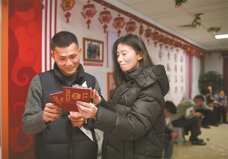 记者在现场看到,婚姻登记处呈现出一派繁忙却又温馨的景象:有的情侣在取号机前井然有序地取号排队;有的正认真填写登记所需信息;还有的刚领取到结婚证,手捧红色证书,或是相互依偎,或是与同行的亲朋好友合影留念,笑容中满是甜蜜与幸福。