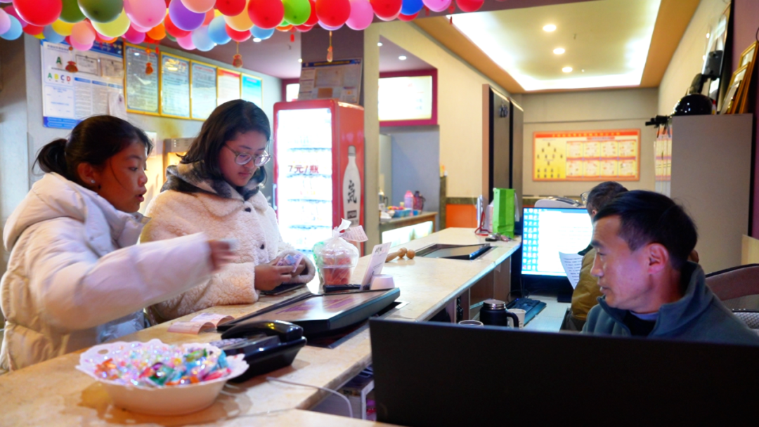 节日里的观影现场,处处洋溢着喜庆氛围。观影大厅内挂满了红彤彤的灯笼,热门影片海报整齐排布,与双节的喜庆氛围完美相融。前来观影的市民、游客络绎不绝,欢声笑语不时从影厅中传出。人群中,小姑娘旦增卓嘎正和姐姐一起购买下午4点半场次《飞驰人生3》的电影票,谈及影片,她眼里满是期待:“今天过年,我约上姐姐来看电影,我们从小就特别喜欢看电影,马上就能看《飞驰人生3》,真的太开心了!”