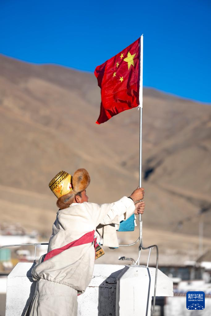 2月16日,长所乡古荣村村民桑杰将一面崭新的五星红旗立在新居屋顶。新华社记者 旦增尼玛曲珠 摄