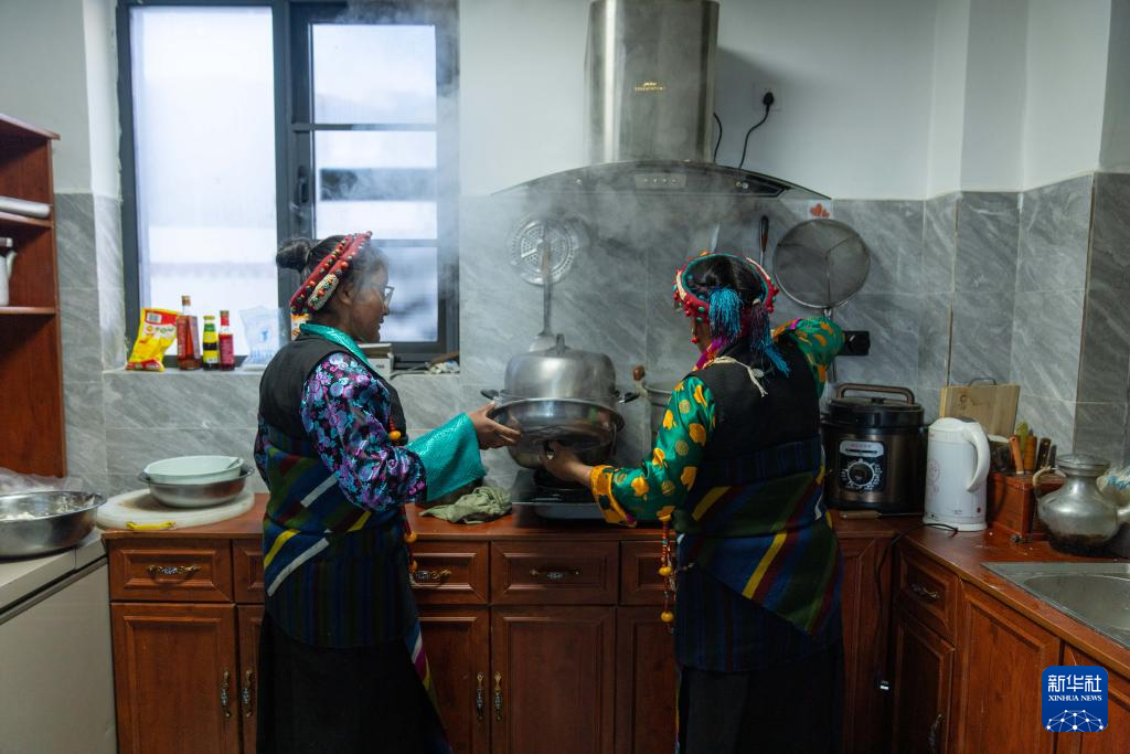 2月16日,长所乡古荣村村民卓玛次仁在新居厨房制作年节食品“古突”。在藏语中,“古”意为“九”,“突”意为“面”,“古突”是一种用牦牛肉汤加入牛肉、萝卜、奶渣等食材熬煮的面食。按西藏传统习俗,“古突”夜,家家户户迎来团聚,一起享用“古突”。新华社记者 旦增尼玛曲珠 摄