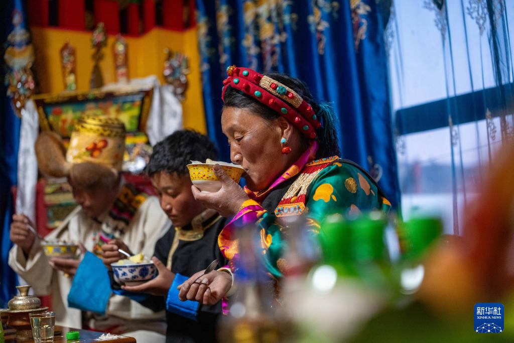 2月16日,长所乡古荣村村民卓玛次仁(右)与家人一起吃年节食品“古突”。在藏语中,“古”意为“九”,“突”意为“面”,“古突”是一种用牦牛肉汤加入牛肉、萝卜、奶渣等食材熬煮的面食。按西藏传统习俗,“古突”夜,家家户户迎来团聚,一起享用“古突”。新华社记者 旦增尼玛曲珠 摄
