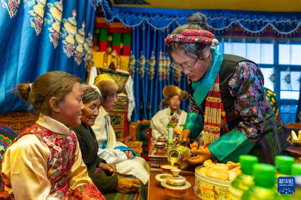 2月16日,长所乡古荣村村民桑杰的大女儿旦增旺姆(右一)给奶奶次仁塔决倒茶。新华社记者 旦增尼玛曲珠 摄