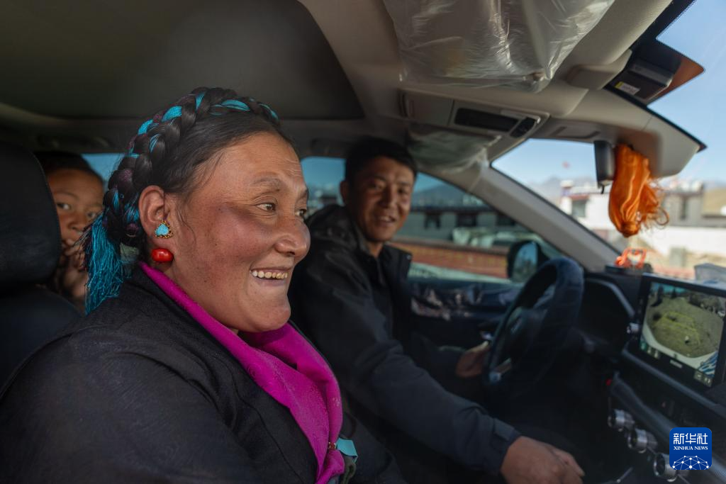 2月16日,长所乡古荣村村民桑杰(右)带着爱人卓玛次仁和小女儿旦增格央去买年货。新华社记者 旦增尼玛曲珠 摄
