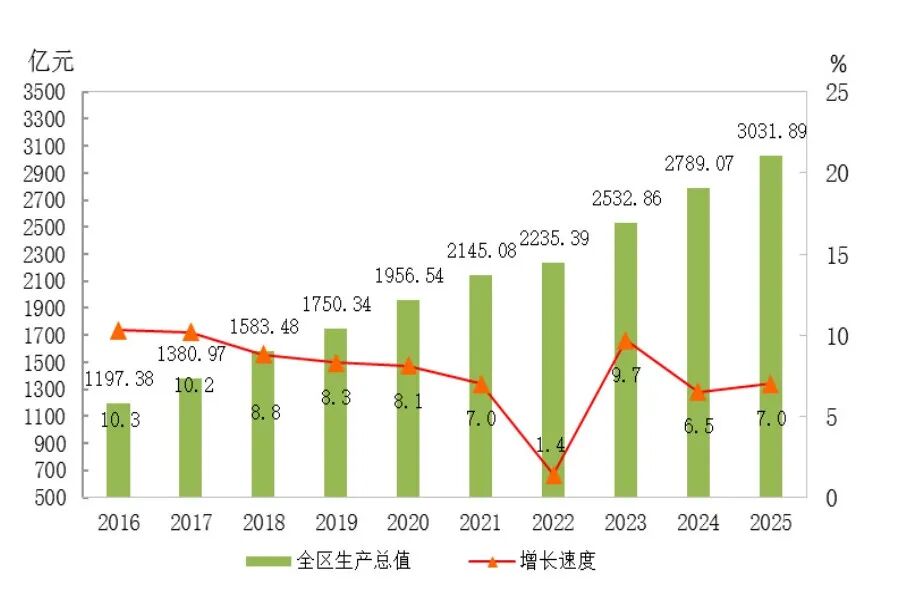 图1 2016-2025年全区生产总值及其增长速度