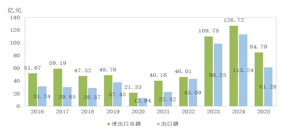 全年货物贸易进出口总额84.79亿元,比上年下降33.1%。其中,出口61.28亿元,下降45.9%;进口23.51亿元,增长74.4%。一般贸易进出口44.75亿元,下降48.7%。其中,出口27.23亿元,下降63.7%;进口17.52亿元,增长44.2%。边境小额贸易进出口28.29亿元,下降20.0%。