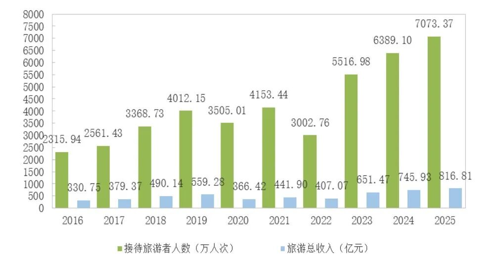图10 2016-2025年接待旅游者人数和旅游总收入