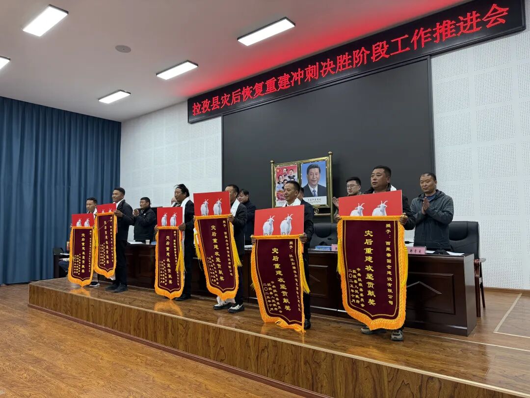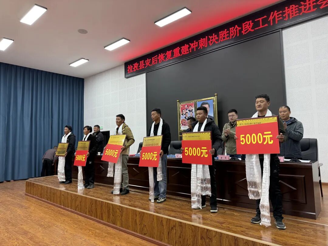 会议深入学习了定日地震灾区灾后恢复重建工作前方指挥部最新会议精神和指示要求,全面通报了全县灾后恢复重建工作整体进展情况及考核排名。为激励先进、鼓舞干劲,会议对9个行政村的村两委和驻村工作队以及11家施工企业进行了表彰,各施工企业在会上进行了庄严的集体宣誓,并现场签订了承诺书,表达了坚决完成重建任务的决心。
