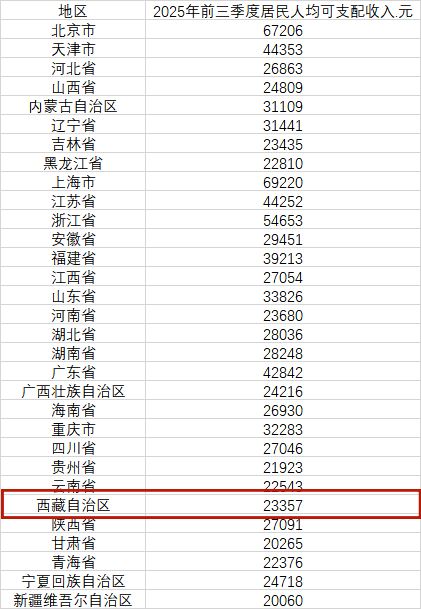 国家统计局网站公布了31个省份2025年前三季度居民人均可支配收入情况。今年前三季度,有11个省份居民人均可支配收入超过3万元,西藏自治区为23357元。