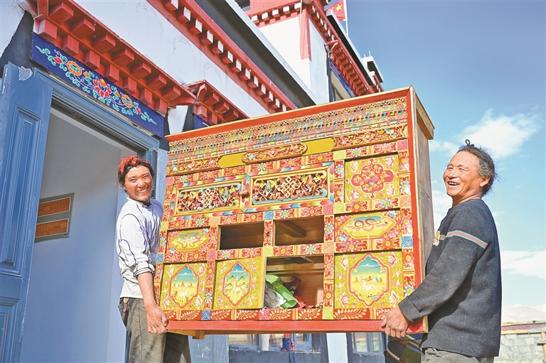 图为定日县措果乡野江村村民往新房里搬家具(资料图片)。记者 平措次仁 摄