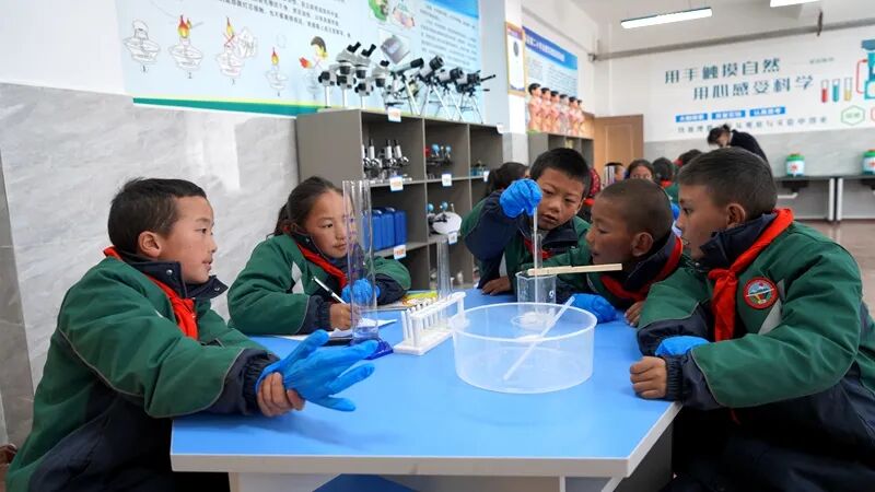 图为那曲市聂荣县第二完全小学开展科创教育活动。