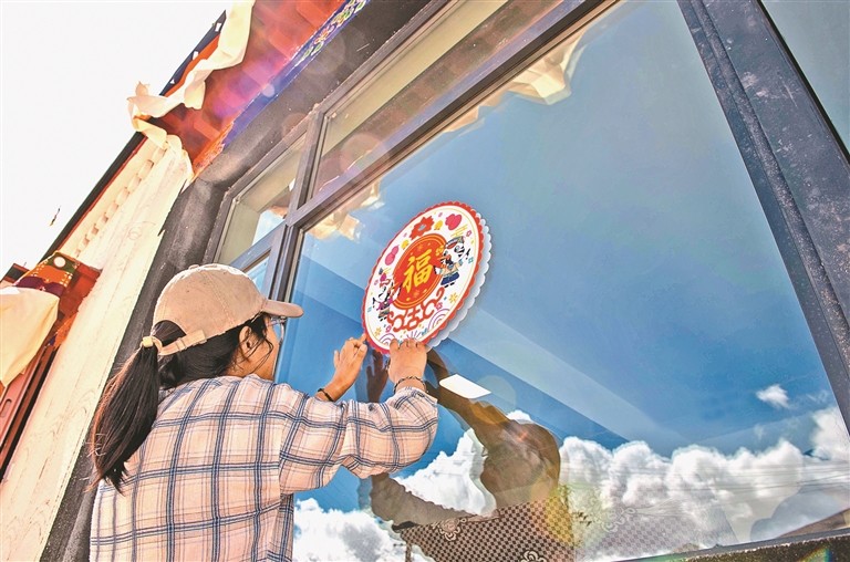 定结县郭加乡乃村重建点,群众正在为新家贴福字。记者 旦增嘎瓦 摄