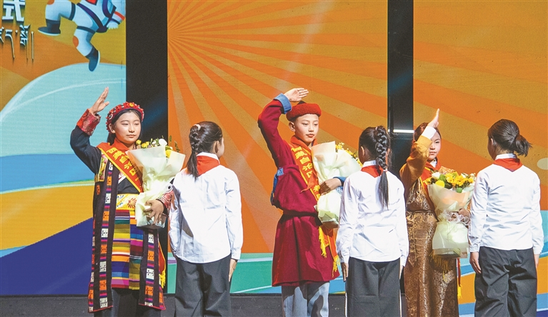图为在2024—2025年西藏自治区“新时代好少年”先进事迹发布仪式上,少先队员代表为“新时代好少年”献花。记者 旦增嘎瓦 摄