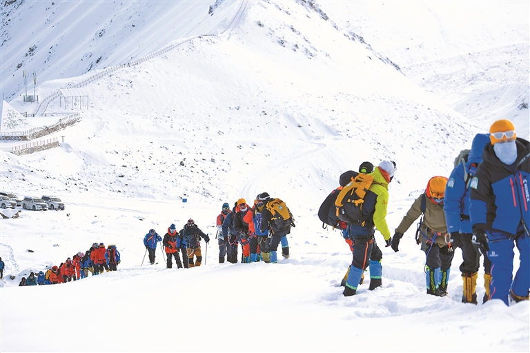 4月29日至5月3日,2025第二十二届中国西藏登山大会暨纪念中国人再登珠穆朗玛峰50周年系列活动——洛堆峰登山探险活动在拉萨市羊八井镇举行。 图为5月2日,登山爱好者向洛堆峰峰顶进发(资料图片)。记者 潘多 郑璐 明吉 摄影报道